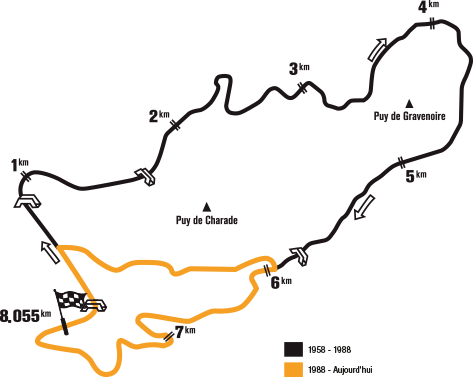 C’est ainsi que le circuit de Charade est imaginé entre la commune de Royat et les villages de Thèdes et Manson tout en faisant le tour du puy de Gravenoire. Le résultat est un magnifique circuit de montagne de 8,055 kilomètres avec 51 virages et d’importants dénivelés. Hélas, Louis Rosier ne verra jamais la concrétisation de son projet ; il décède à la suite de son accident sur le circuit de Montlhéry le 29 octobre 1956. C’est donc sans lui que les pilotes découvrent le 27 juillet 1958 le circuit de montagne d’Auvergne à l’occasion des 3 Heures d’Auvergne.