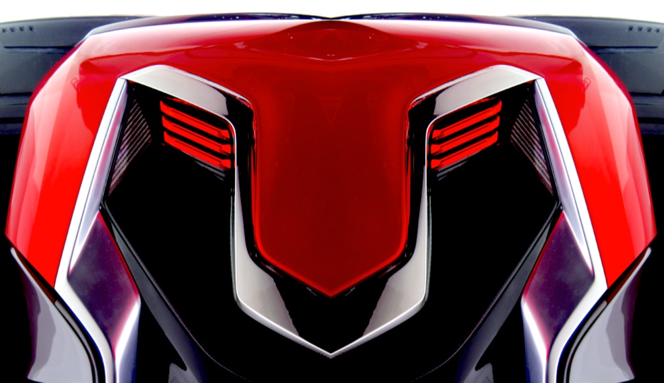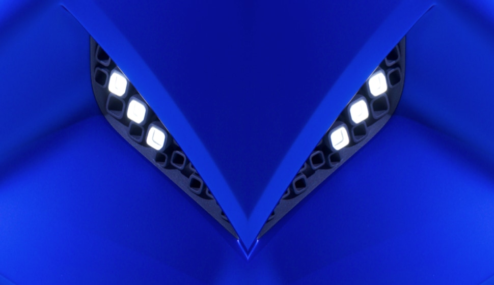 La face avant présente un regard intensément expressif. Telle la pupille d’un oeil, la lentille d’une caméra est disposée au centre de chaque projecteur Leds. Cette optique visionne l’environnement du véhicule pour alimenter en informations les systèmes d’aide à la conduite. La calandre présente une perméabilité différente selon l’emplacement. Cette structure semi-creuse reçoit un Lion dont la base s’anime en blanc à l’enclenchement du mode Autonomous.