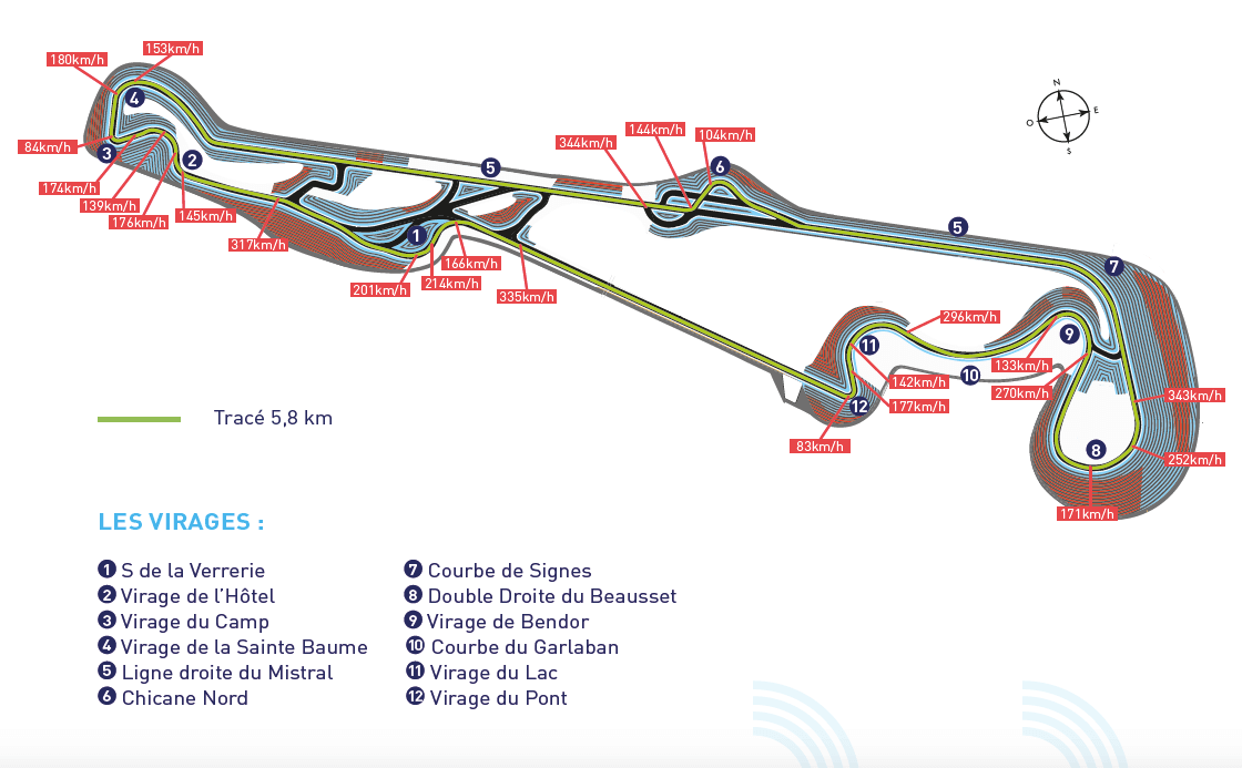 Par exemple, la ligne droite Mistral va offrir de superbes opportunités de dépassements et confère un certain cachet au tracé avec une configuration à trois lignes droites. Les enchaînements de virages sont variés, le rythme sera très intéressant, et les monoplaces évolueront en configuration aérodynamique medium.